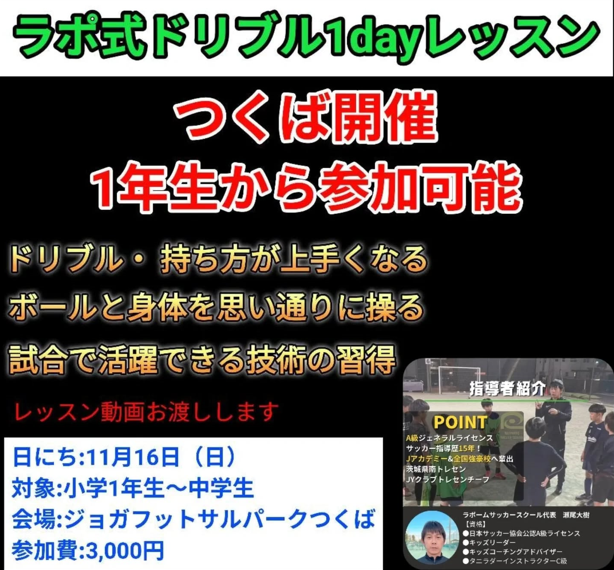 【つくば開催】11/16(日)1dayレッスン〜ラポ式ドリブルトレーニング〜